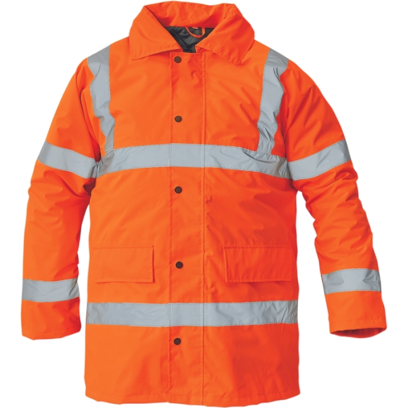 Heat insulated, waterproof (class 3 pursuant to EN 343) and breathable (class 1 pursuant to EN 343) high visibility winter jacket made of 100% 300D Oxford polyester, coated with PU layer. It has inner cuffs, reflective strips and a hood that can be rolled into a collar. Available in different color combinations.