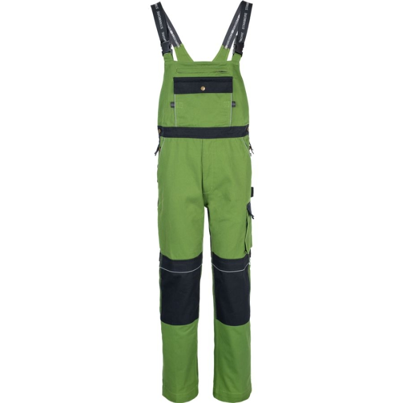 Modern fit work bib pants made of 100% cotton, 275 g/m² with reflective details, wide, elastic suspenders and multiple functional pockets (including the pockets for inserting knee pads). They have metal zipper and press studs fastening. Available in different colors.
