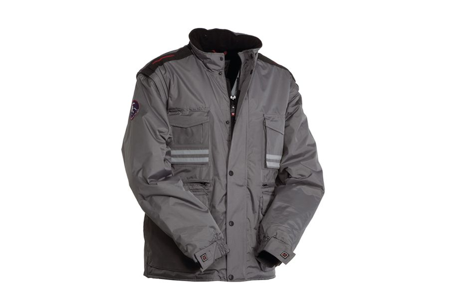 Men’s jacket with detachable sleeves, 8 mm plastic zip with metal pull, with flap fastening and plastic buttons, detachable and/or foldaway shaped hood, adjustable cuffs, grey reflective stripes on the front and back, pre-shaped elbows and side vent with gusset and zip, nine outer pockets, two with LOCK SYSTEM, two with zip and reinforced inner, one with a reversible badge holder. Padded, micro-fleece inside collar, back and lower back warmer, breathable underarm inserts, inner drawstring and zip for easier printing and embroidery, hood that is packed in a collar.
